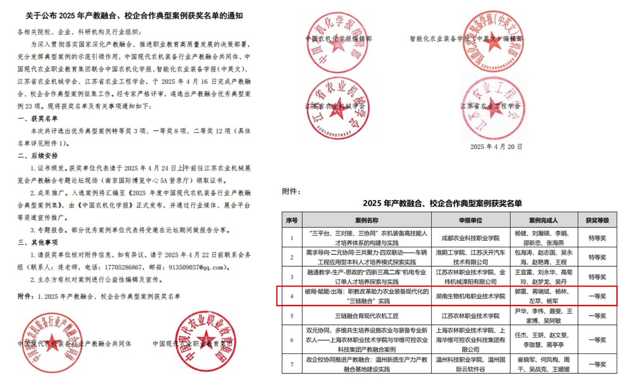 2025年4月20日,由中国现代农机装备行业产教融合共同体、中国现代农业职业教育集团联合主办的2025年产教融合、校企合作典型案例评选结果揭晓。我院申报的《破局·赋能·出海:职教改革助力农业装备现代化的“三链融合”实践》案例荣获一等奖!该案例由郭雷、蒋瑞斌、杨林、左萃、杨军教师团队主导,以“党建引领、产教闭环、标准输出”为核心,聚焦农业机械化“技术滞后、人才短缺、产教脱节”三大难题,构建“三链融合”(组织链共建、产业链对接、价值链延伸)产教协同生态,形成可复制的“湖南模式”。此次获奖案例将汇编至《2025年度中国现代农机装备行业产教融合典型案例集》,由《中国农机化学报》正式发布,并通过行业展会、媒体平台等多渠道宣传推广。