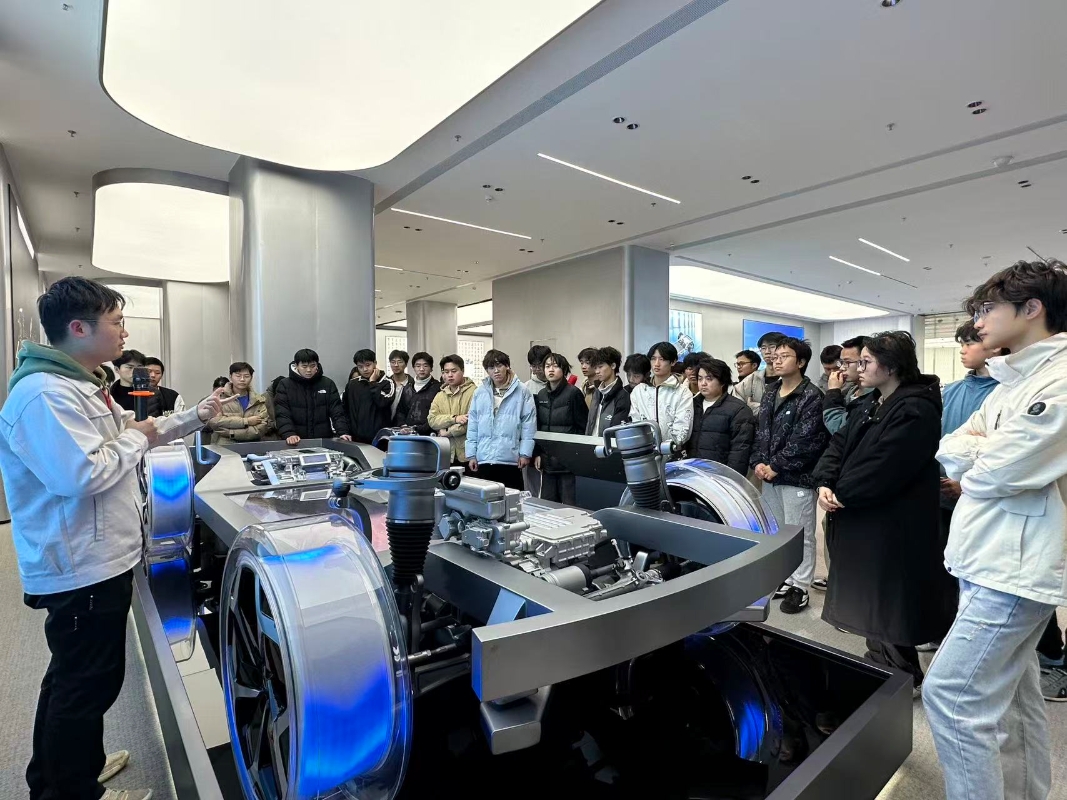活动当天,师生一行在比亚迪工作人员的引导下,首先参观了企业展厅。通过丰富的展品与多媒体资料,同学们系统了解了比亚迪从电池起家到成为新能源汽车行业巨头的辉煌发展历程,以及其在电动汽车、储能、轨道交通等领域的多元化产业布局。展厅内陈列的刀片电池、e平台3.0等核心技术成果,让学生们深刻感受到了科技创新的力量。