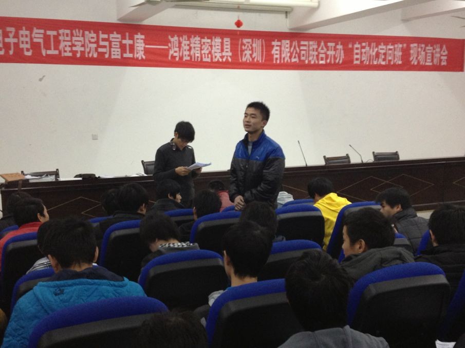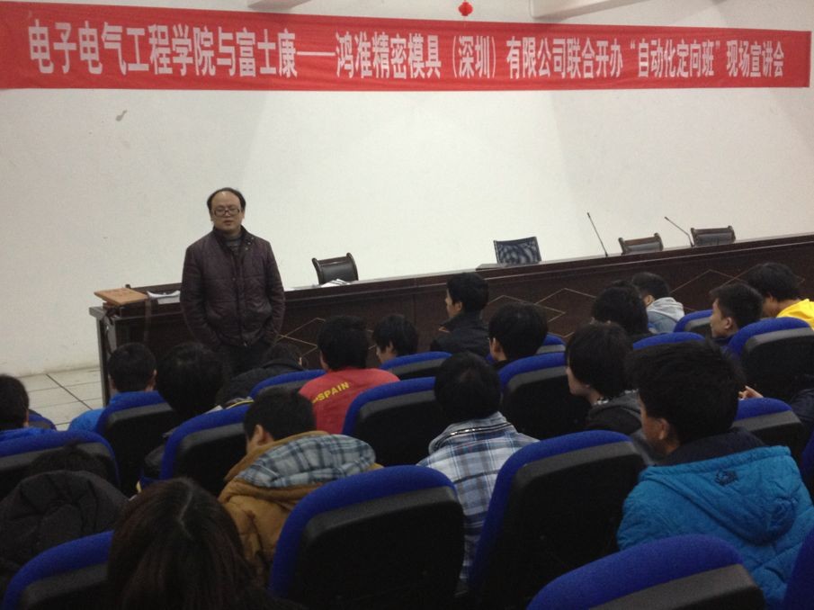 2012年12月15日,车辆工程学院与富士康科技集团鸿超准事业群——鸿准精密模具(深圳)有限公司在我院机电大楼就业报告厅举办了“自动化人才定向班”宣讲会。车辆工程学院院长杨培刚、副院长黄建科、副院长蒋瑞斌出席了宣讲会,参加宣讲会的学生共有129名。