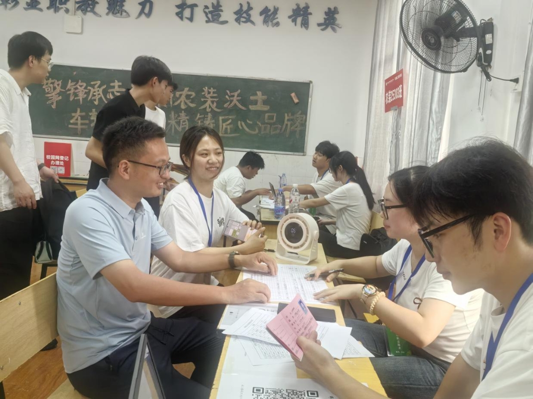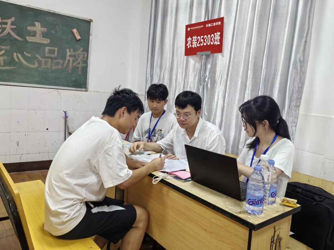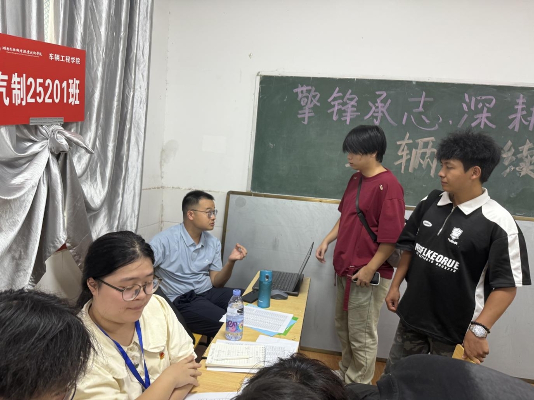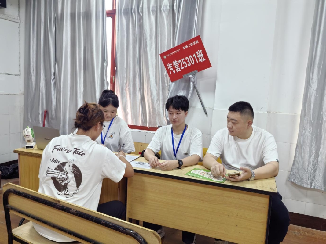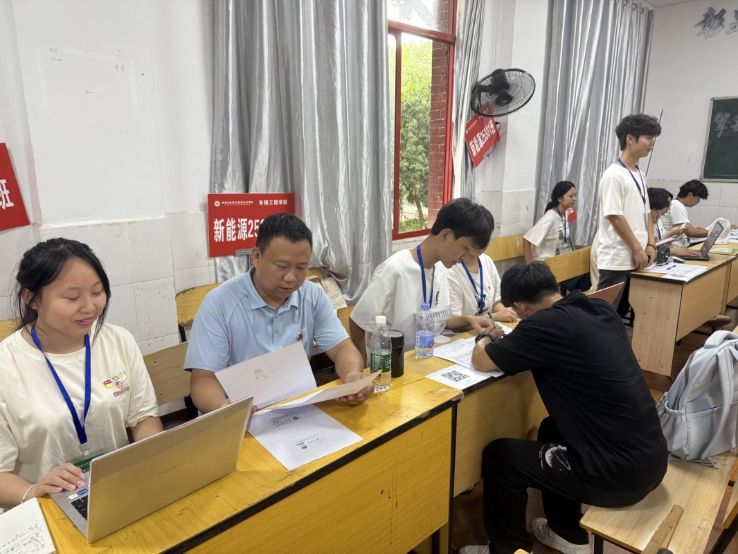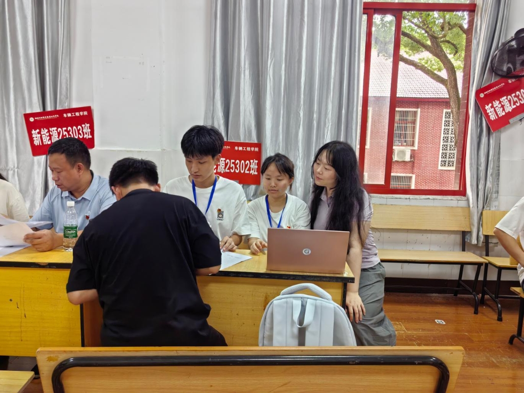 报到现场教室里更是秩序井然。各迎新教室的黑板报上,学姐学长书写的"擎锋承志深耕农装沃土  车辆赓续精铸匠心品牌",既彰显了学院办学特色,也为有序的现场增添了青春绚丽的色彩。助理班主任们围在工作台前,熟练地核对新生资料、协助人脸录入,指尖在系统上轻快滑动,原本繁琐的流程被梳理得清晰高效,不到十分钟就能完成全套手续。刘磊、何杰等全体新生班主任、辅导员们化身"暖心家长",拉着新生的手唠起家常:"去食堂吃饭了吗?""有遇到什么困难吗?"简单的几句问候,瞬间驱散了新生初来乍到的局促。